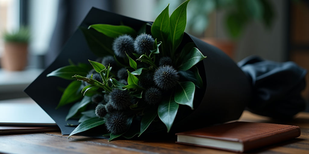 Отдавайте предпочтение строгим формам и лаконичной упаковке: моно-букеты, тёмные или нейтральные тона, крупные листья для фактуры.