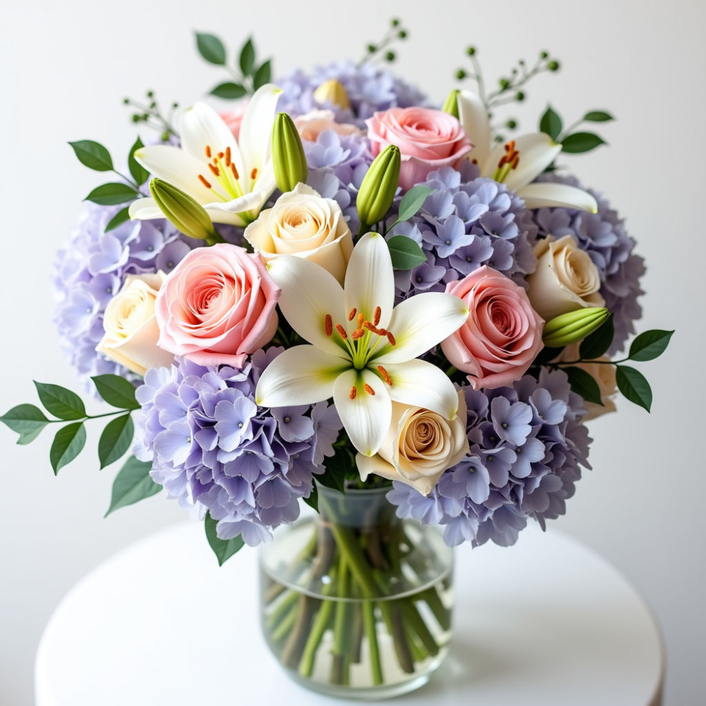 Гортензии: Пышные шапки гортензий придают букетом объем и текстуру. Их нежные цветы различных оттенков пастельной гаммы подчеркивают элегантность розы и лилий. Мы используем только свежие гортензии с насыщенным цветом и крепкими стеблями.