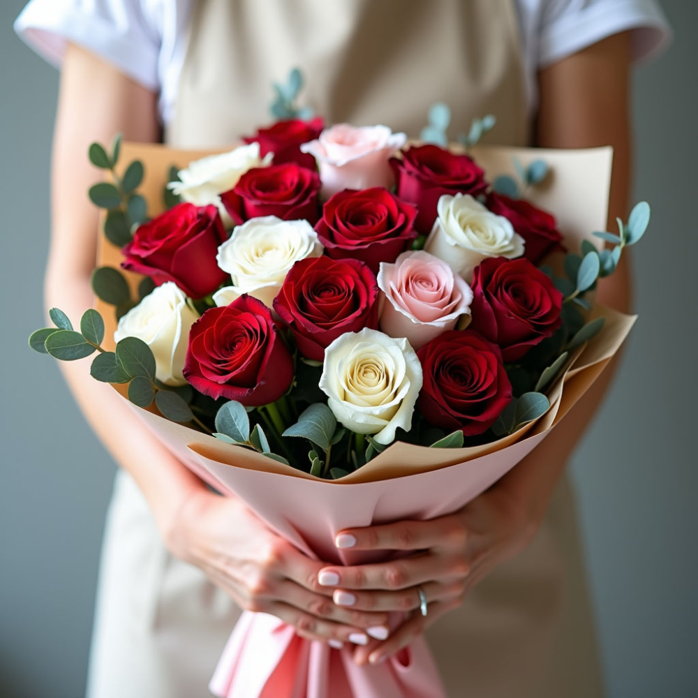 Этот букет символизирует нежность, уважение и восхищение. Сочетание разных оттенков роз создает неповторимую красоту и элегантность. Эвкалипт добавляет свежести и аромата.