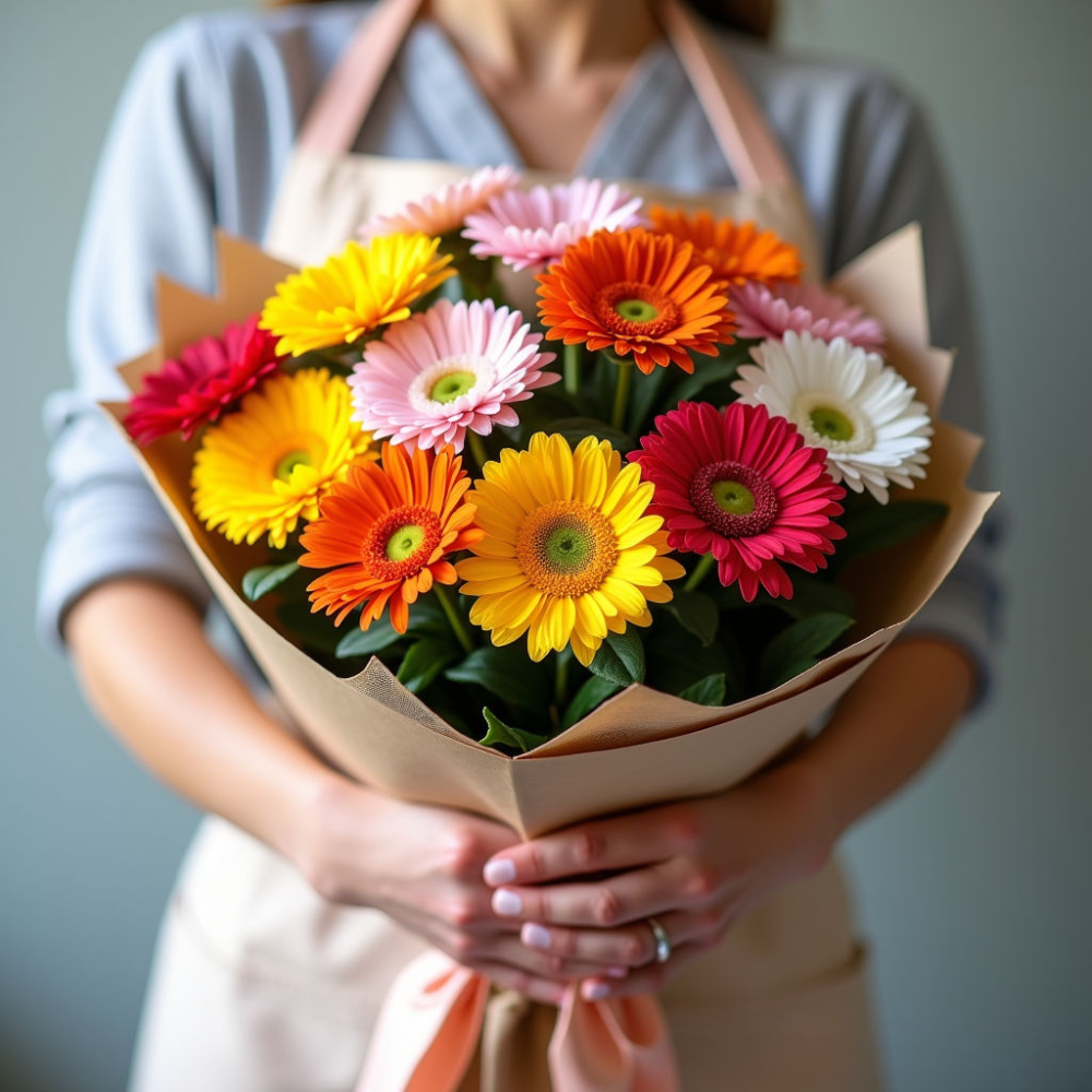 Состав: 5 мини-гербер, Россия, упаковка — крафт или сетка на выбор. Каждый цветок отобран вручную, чтобы гарантировать высокое качество и свежесть.
