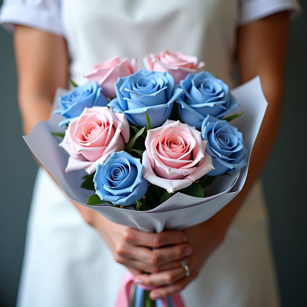 Этот букет пленяет своим нежным голубовато-розовым оттенком и легким сладковатым ароматом. Он создает атмосферу романтики и уюта, наполняя пространство гармонией и теплом.