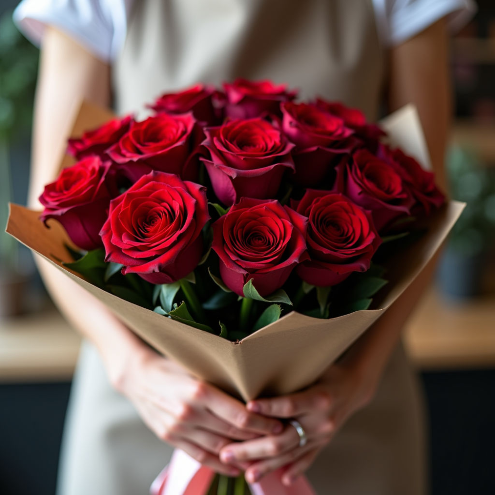 Визуально букет притягивает взгляд своим ярким, насыщенным цветом и изысканным обликом. Аромат этих роз создает атмосферу уюта и романтики, наполняя каждый момент особым смыслом и теплотой.