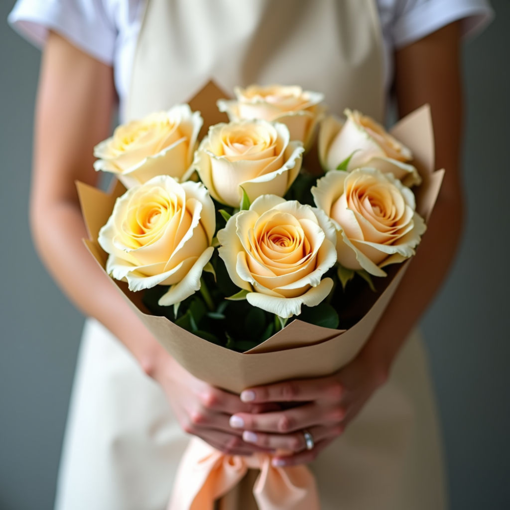 Этот букет поражает своей утонченной красотой: нежно-желтые лепестки с легким розовым оттенком создают атмосферу тепла и радости. Аромат этих роз наполняет пространство свежестью, даря ощущение праздника и уюта.