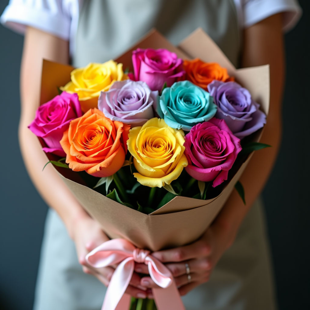 Состав: 7 роз "Star Rainbow", Эквадор, оформлены в стильную упаковку из крафт-бумаги с атласной лентой.
