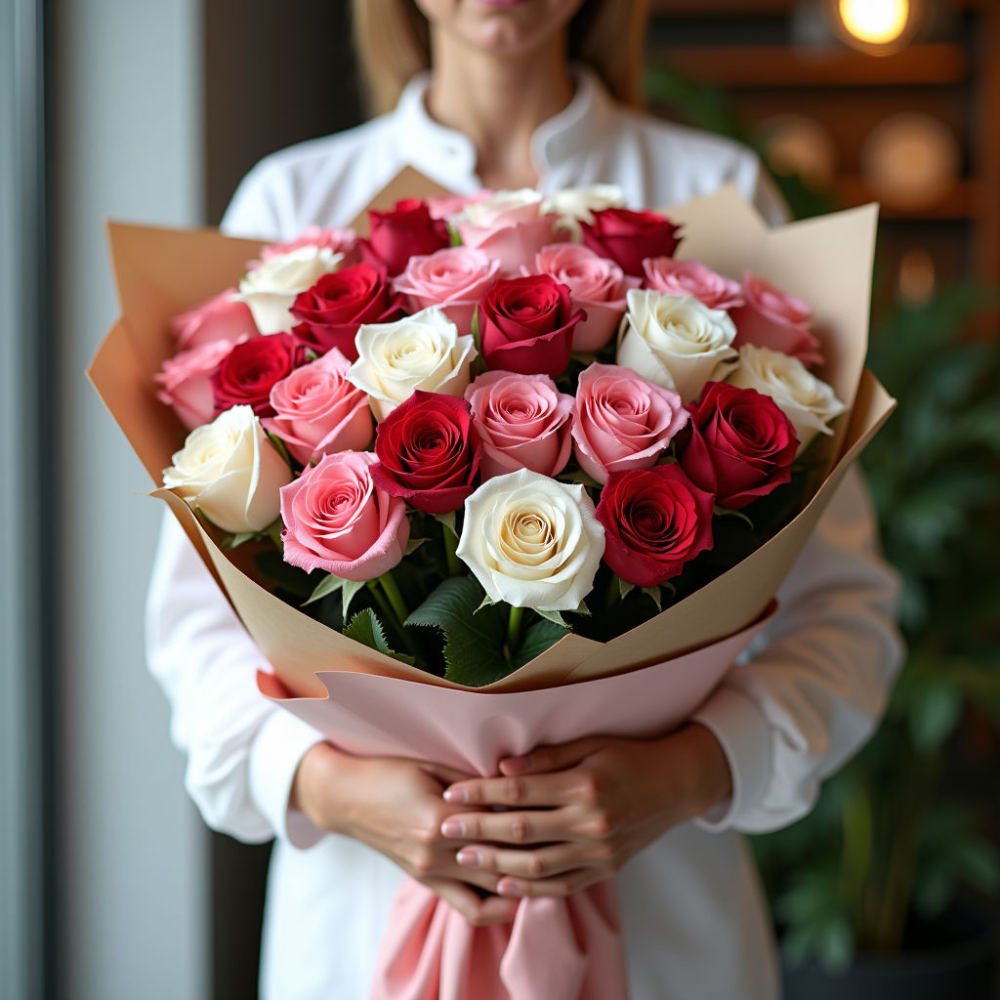 Состав: розы различных оттенков, страна происхождения — Эквадор. Упаковка выполнена в элегантном стиле, подчеркивающем красоту цветов и создающем эффектный визуальный образ.