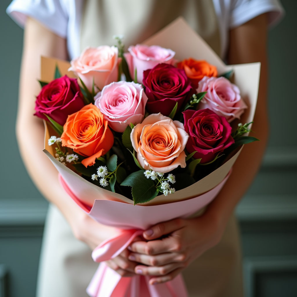 Этот букет создает яркий визуальный образ, наполняя пространство нежным ароматом и радостью. Цвета роз гармонично сочетаются друг с другом, создавая атмосферу праздника и уюта, которая обязательно порадует получателя.