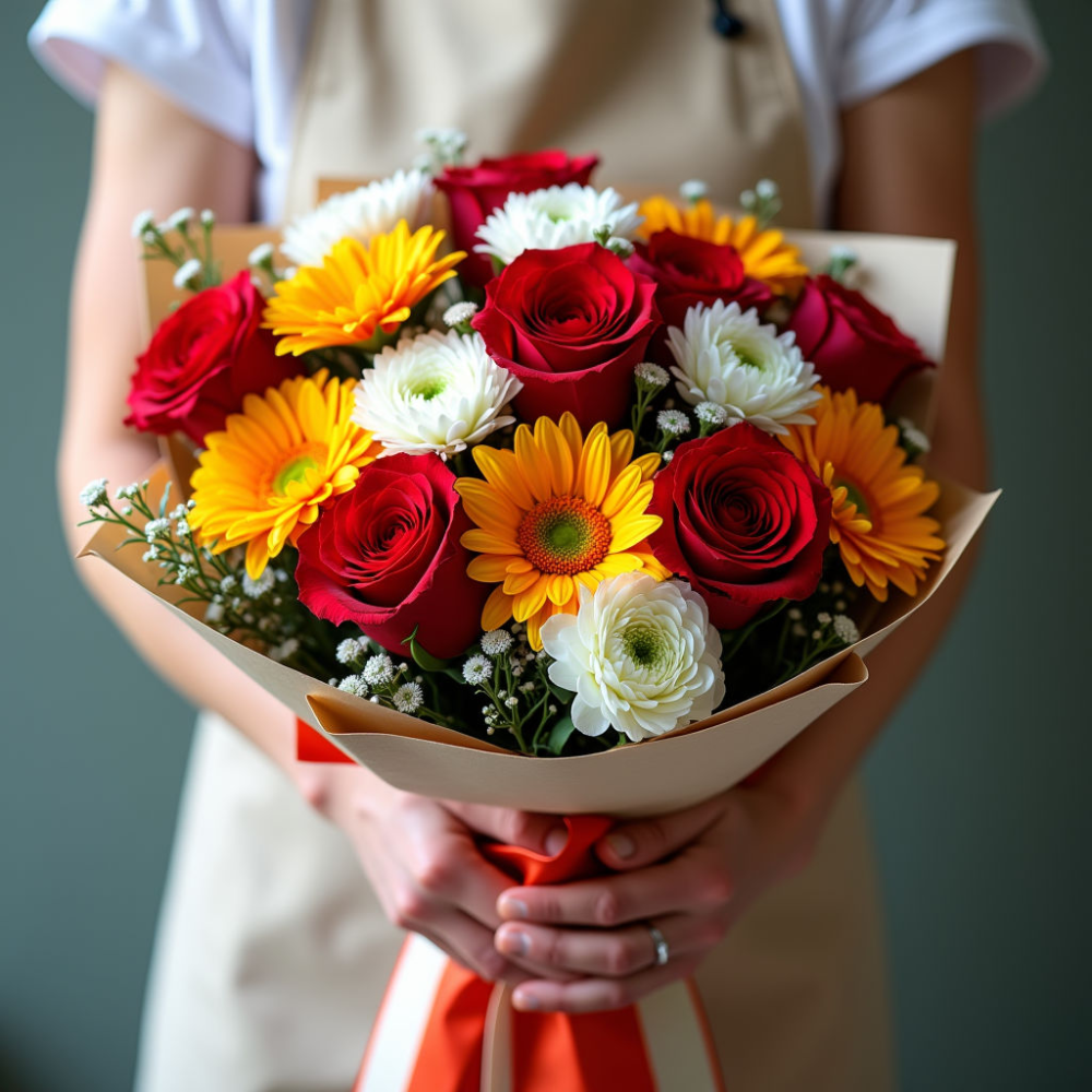 Состав: розы, герберы, хризантемы, гвоздики. Цветы привезены из Нидерландов и Эквадора, упаковка выполнена в стильной крафтовой бумаге с атласной лентой.