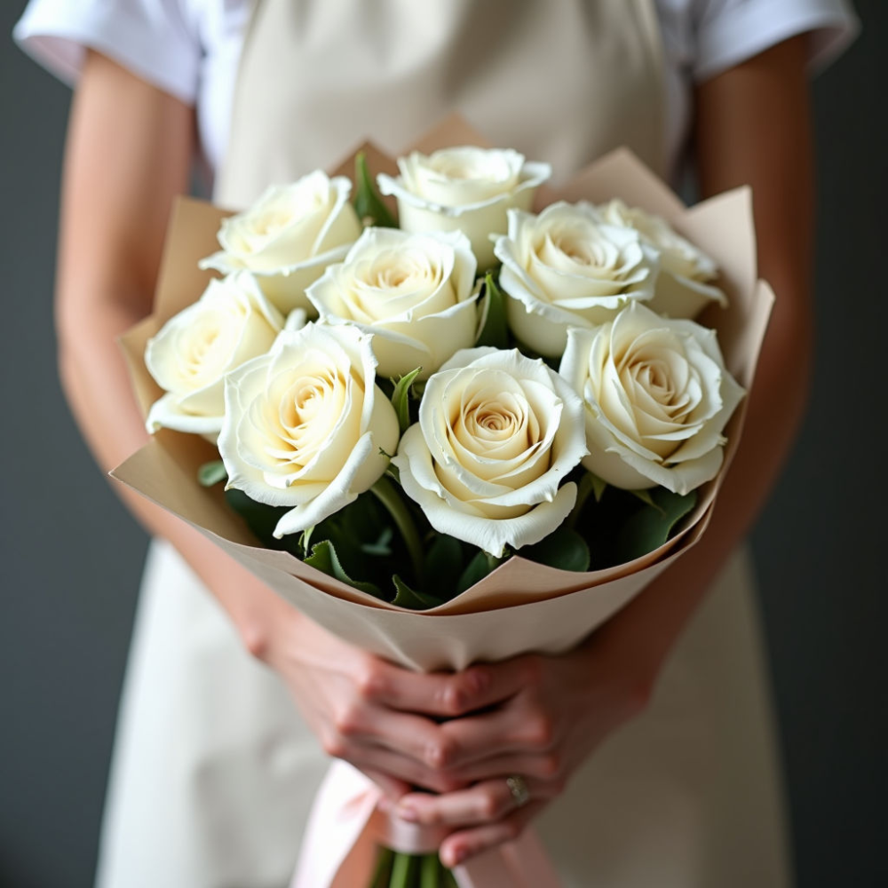 Изысканный букет из 9 белоснежных роз – классика жанра, символ чистоты и нежности. Идеальный подарок для любого случая: от романтического свидания до торжественного события.
