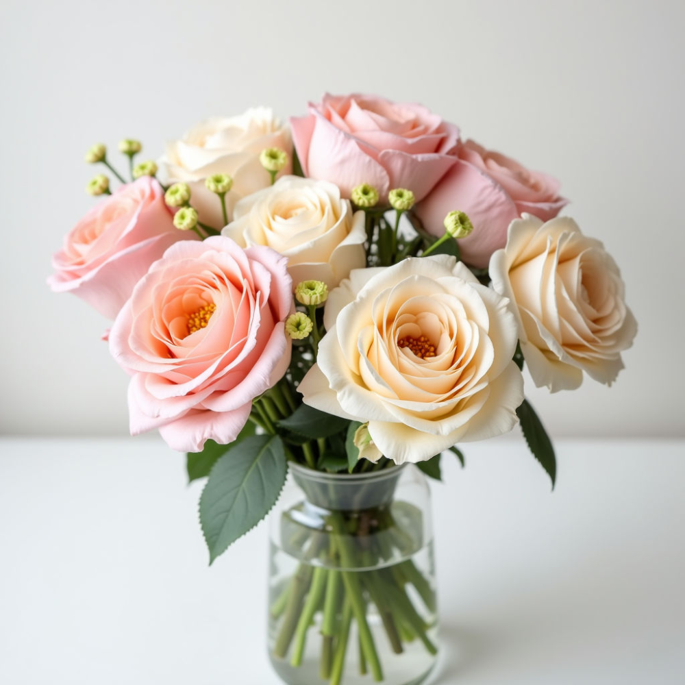 В состав букета входят 4 спрей-розы и 3 эустомы (лизиантуса). Мы используем только свежие цветы высшего качества, гарантируя длительное сохранение их красоты и аромата.