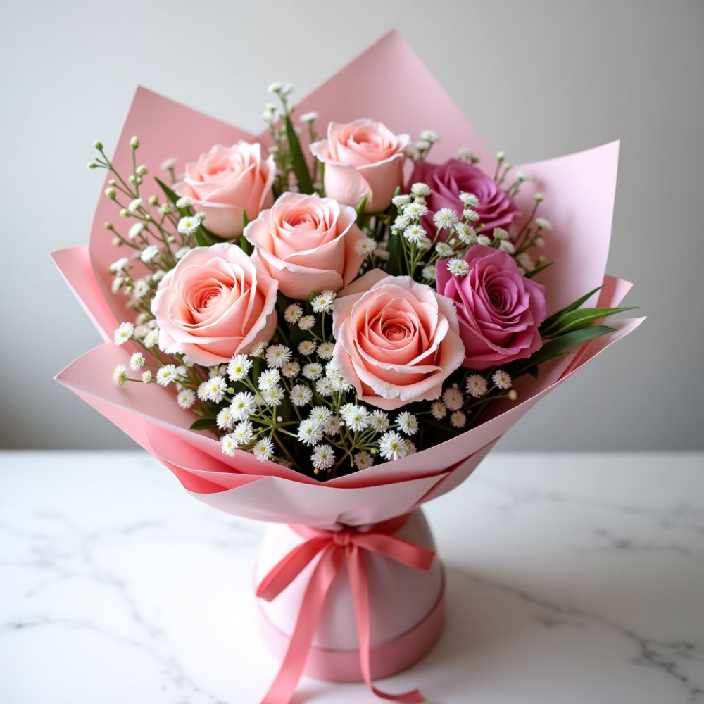 - Гипсофила: 1 пучок. Воздушная гипсофила создает легкий и романтичный фон, подчеркивая красоту роз и гвоздик. Она добавляет букету объема и текстуры.
