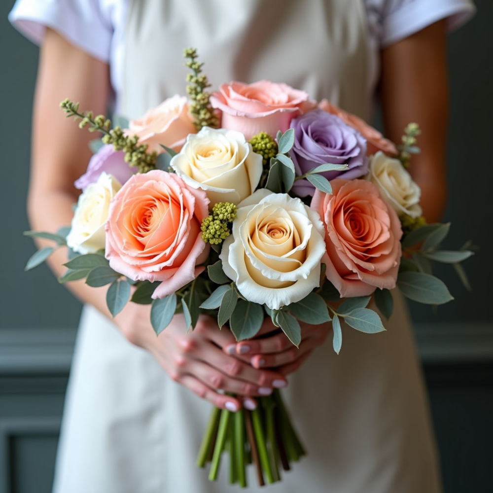 В состав входят: 5 роз, 2 лизиантуса, 2 альстромерии и эвкалипт. Пастельные тона создают атмосферу романтики.