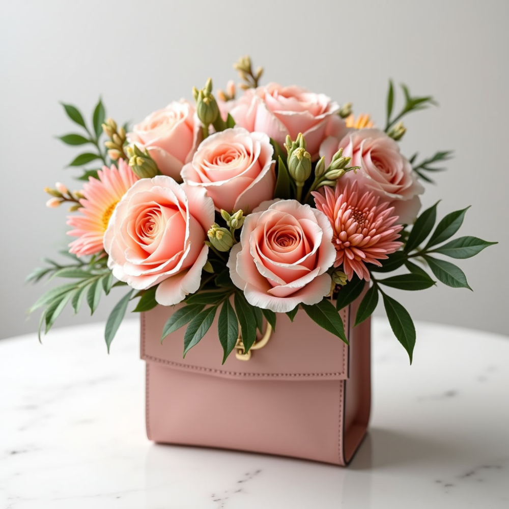 Представьте: утонченные розы, символизирующие любовь и страсть, гармонично сочетаются с яркими альстромериями, которые вносят нотку веселья и оптимизма. Нежная зелень подчеркивает красоту цветов и создает ощущение свежести. Все это изысканно собрано в стильной сумочке, которая сама по себе является прекрасным украшением. Это не просто букет, это целая композиция, завершённая и самодостаточная.