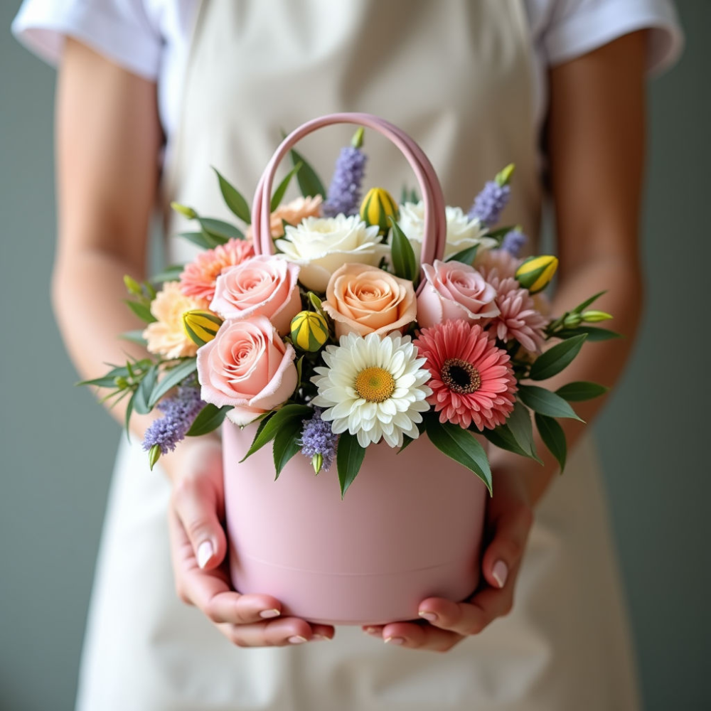 Эта очаровательная композиция представлена в элегантной сумочке, которая сама по себе является прекрасным дополнением к букету. Нежные пастельные тона или яркие, сочные цвета – выбор за Вами! Наши флористы с удовольствием помогут подобрать оптимальную цветовую гамму и состав букета, учитывая Ваши пожелания и предпочтения получательницы. Сумочка выполнена из качественных материалов и после того, как цветы завянут, может использоваться как стильный аксессуар.