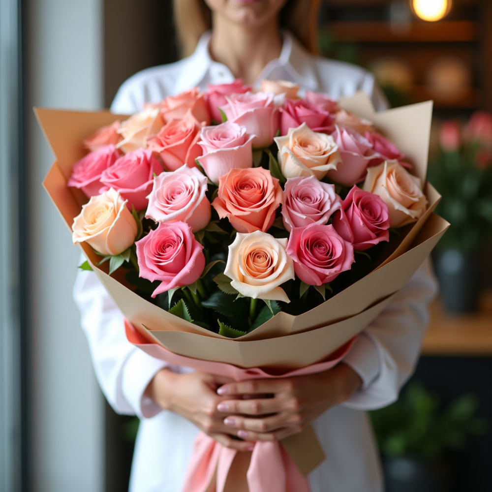 Этот букет восхищает своим разнообразием оттенков: от нежных пастельных до ярких насыщенных тонов. Аромат роз наполняет пространство, создавая атмосферу уюта и тепла, что делает его идеальным для романтического вечера или торжественного события.