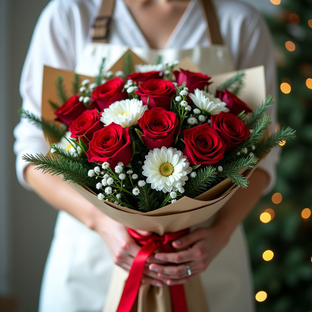 Этот букет наполняет пространство волшебством и уютом. Яркие красные и белые оттенки цветов создают контраст с зелеными еловыми ветками, а их нежный аромат напомнит о зимних праздниках и семейных вечерах у камина.