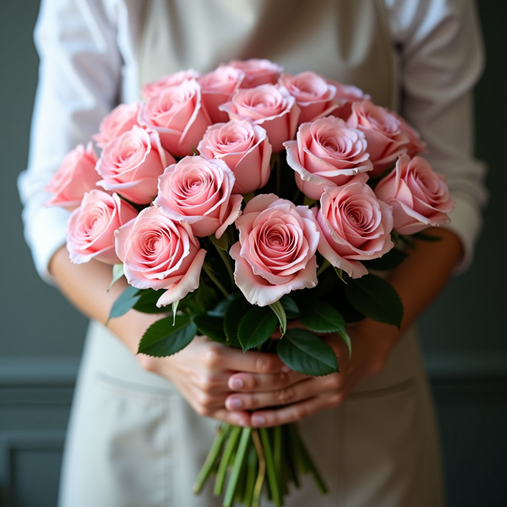 Изысканный букет из 25 нежно-розовых роз – воплощение романтики и элегантности. В состав входят 25 роз высшего качества, дополненных изумрудной зеленью.
