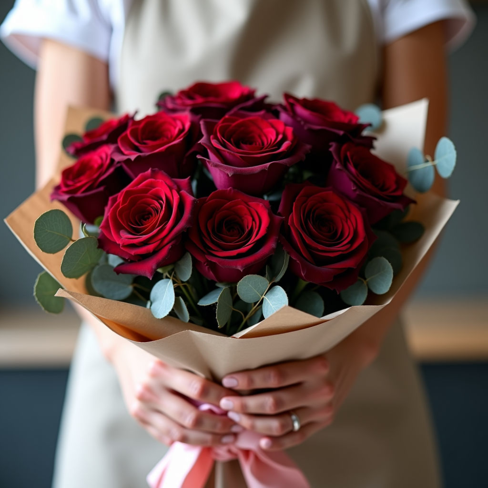 Эвкалипт, используемый в качестве дополнения, придает букетам Хейли свежесть и легкую, ненавязчивую нотку аромата. Его серебристо-зеленые листья гармонично сочетаются с темными лепестками роз Kahala, создавая идеальный баланс цветов и текстур. Эвкалипт также помогает сохранить свежесть роз дольше.
