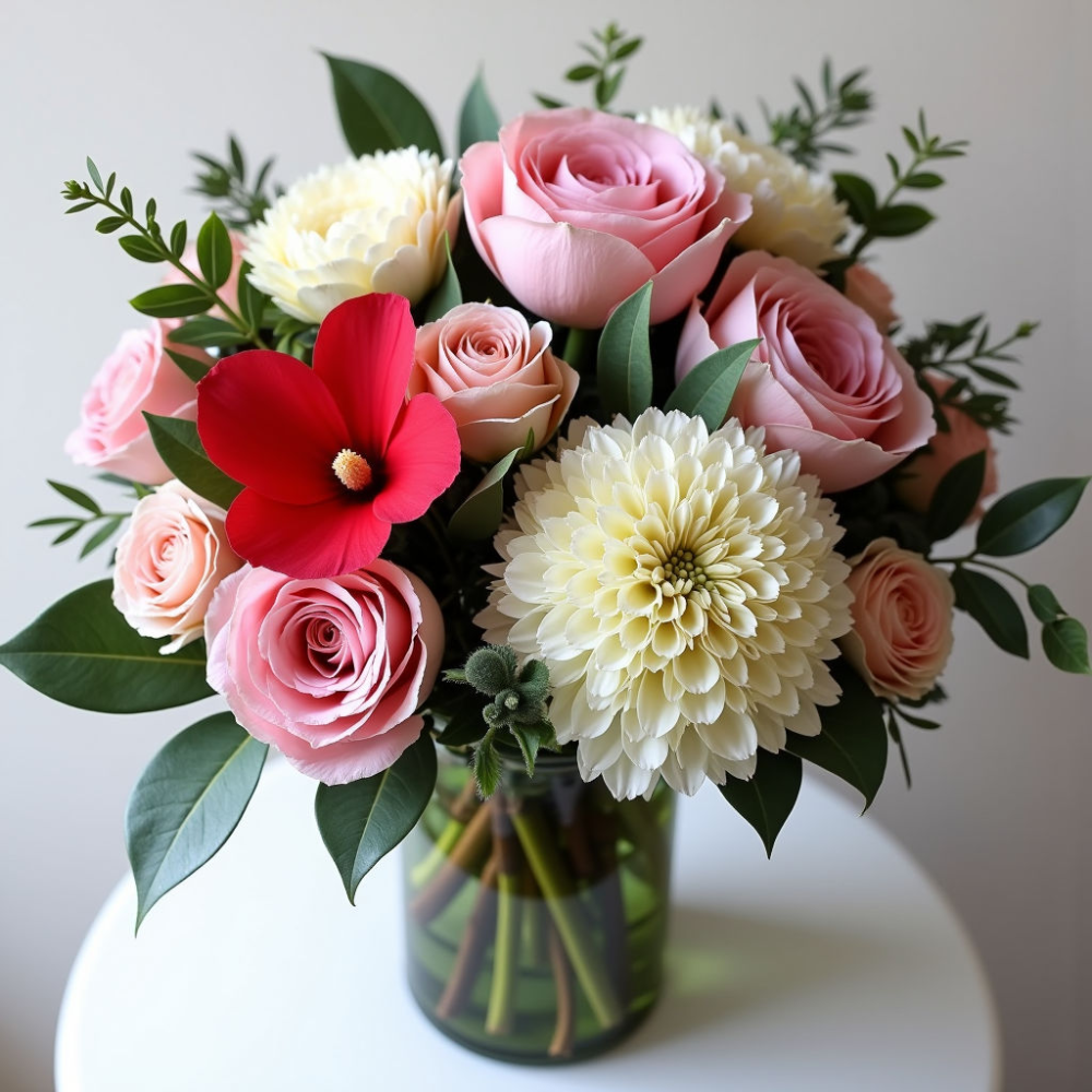 Этот роскошный букет, созданный флористами Базы цветов в Санкт-Петербурге, сочетает в себе элегантность и страсть. Нежная роза, окруженная пышными пионовидными розами, создает ощущение мягкости и романтики. Добавление гортензии привносит нотку свежести и изысканности, а яркий антуриум добавляет экзотической красоты и символизирует сильные чувства. Темно-зеленый илекс выгодно оттеняет яркие цветы, создавая гармоничный и полный букет. Хризантемы дополняют композицию, добавляя объема и текстуры. Декоративные элементы, тщательно подобранные флористами, придают букету завершенный и стильный вид.