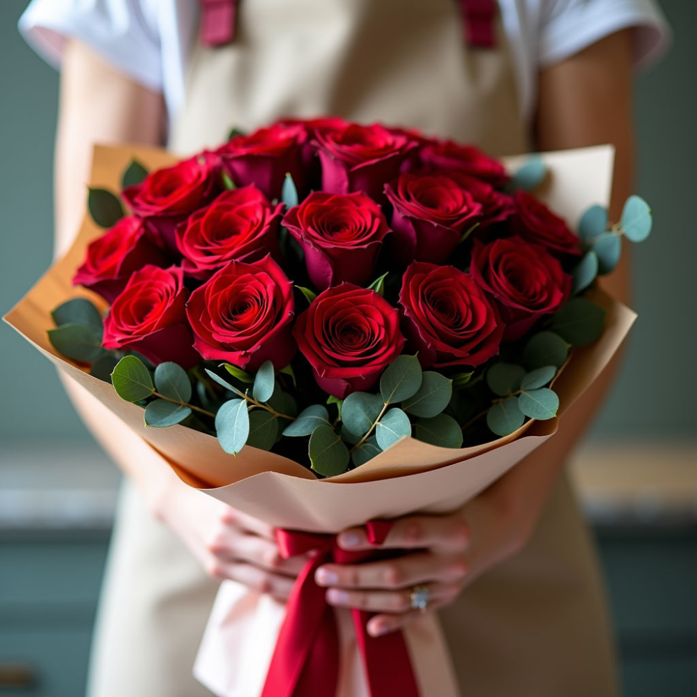 - Эвкалипт. Его свежий аромат и изумрудная зелень прекрасно дополняют красоту роз, создавая гармоничный и стильный букет.