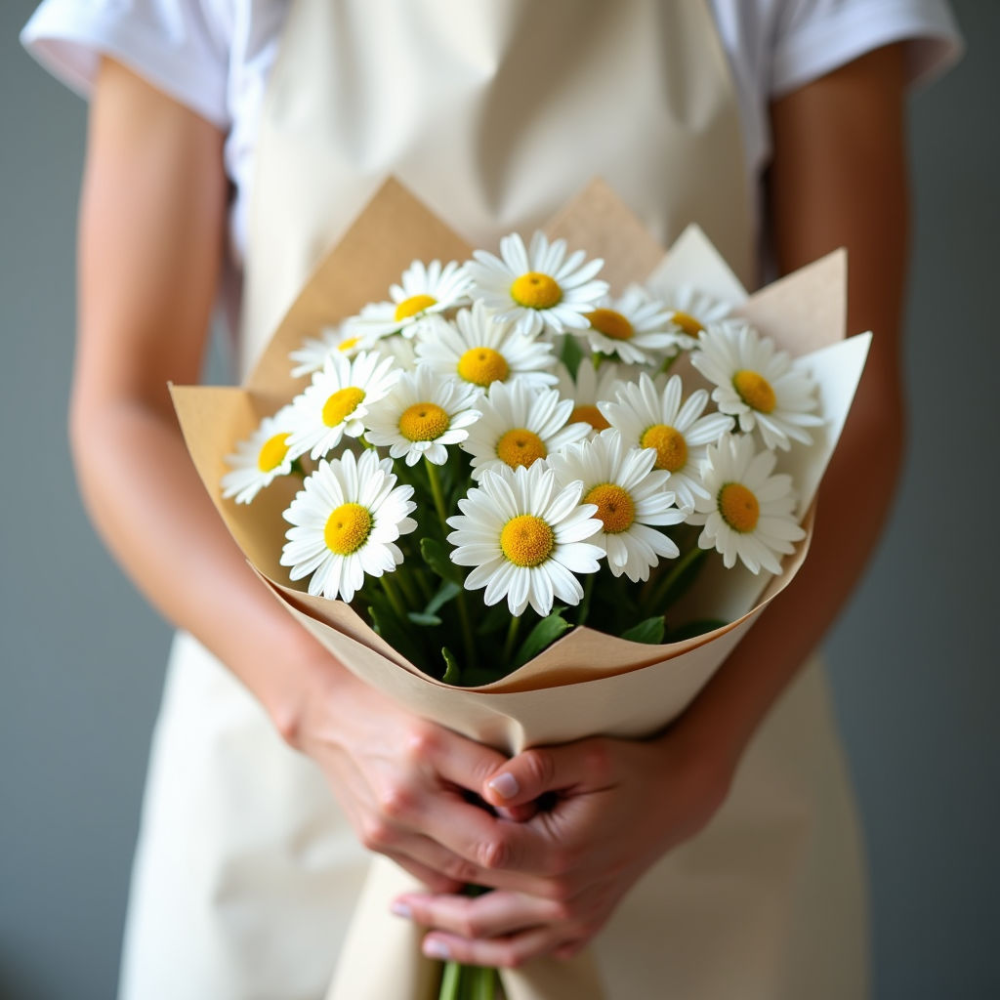 В состав букета входит пучок ромашек. Простота и очарование в каждой детали.