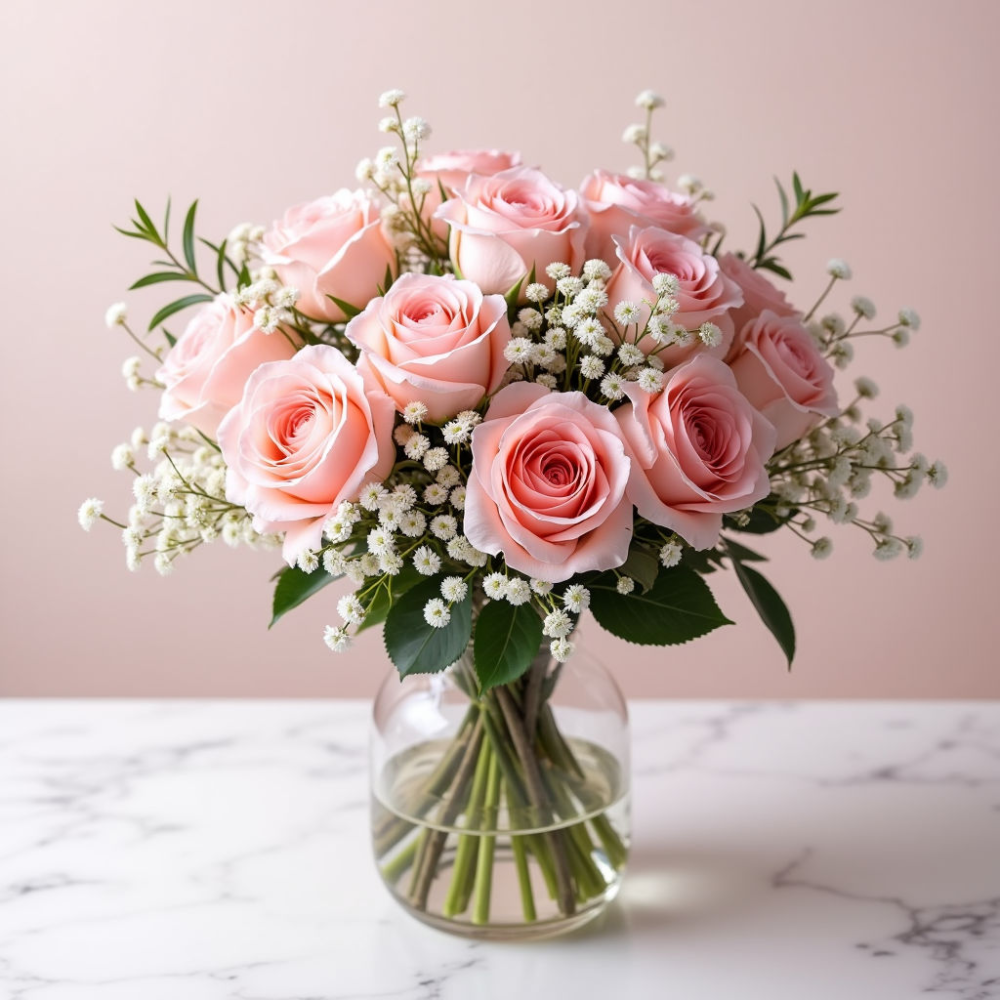 Нежный и романтичный букет Розовые времена – идеальный подарок для любимой, подруги или коллеги. Сочетание розовых роз и воздушной гипсофилы создает ощущение легкости и нежности.