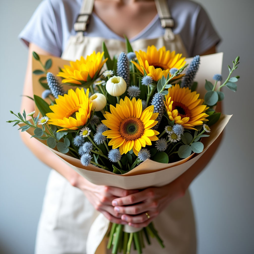 - Эрингиумы (3 шт.): Эти необычные цветы с сине-стальными шишками добавляют букету текстуры и оригинальности. Они прекрасно контрастируют с желтыми подсолнухами, создавая интересную игру цветов и форм.