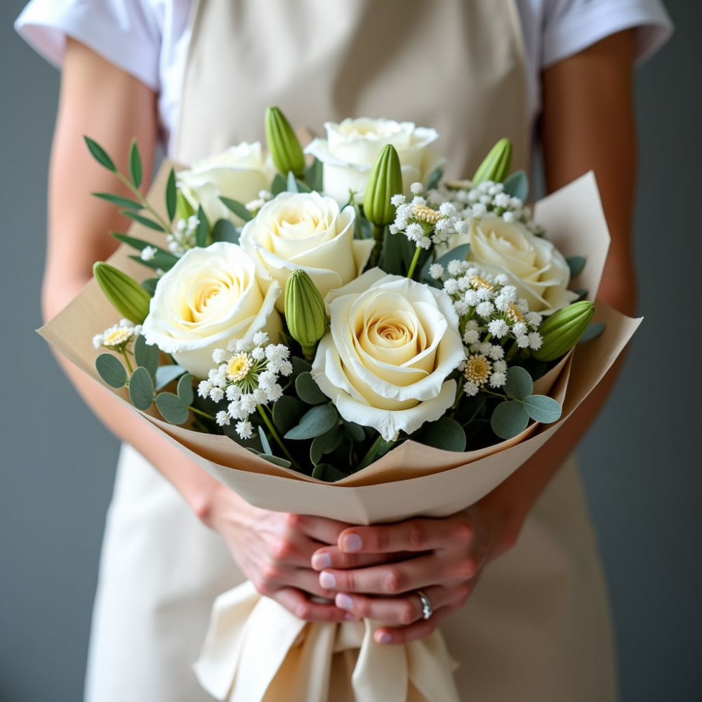 В его состав входят: 3 хризантемы бигуди, 3 розы Mondial белого цвета (50 см), 3 альстромерии, 2 гипсофилы и эвкалипт. Гармоничное сочетание цветов и текстур создает неповторимый образ.