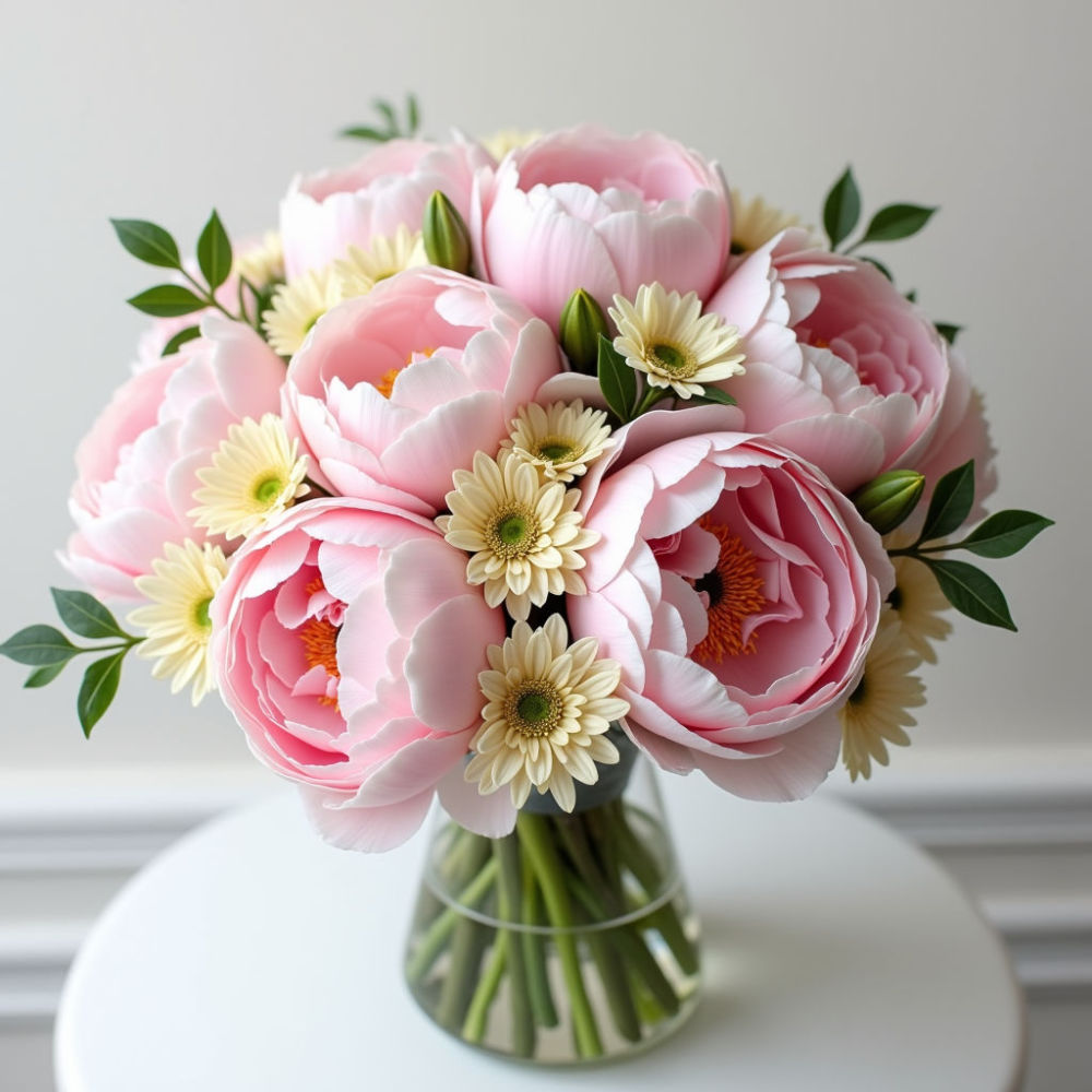 Завораживающий букет Звездные Грезы – изысканное сочетание нежных пионов и элегантных хризантем сантини. Идеальный подарок для выражения самых теплых чувств.