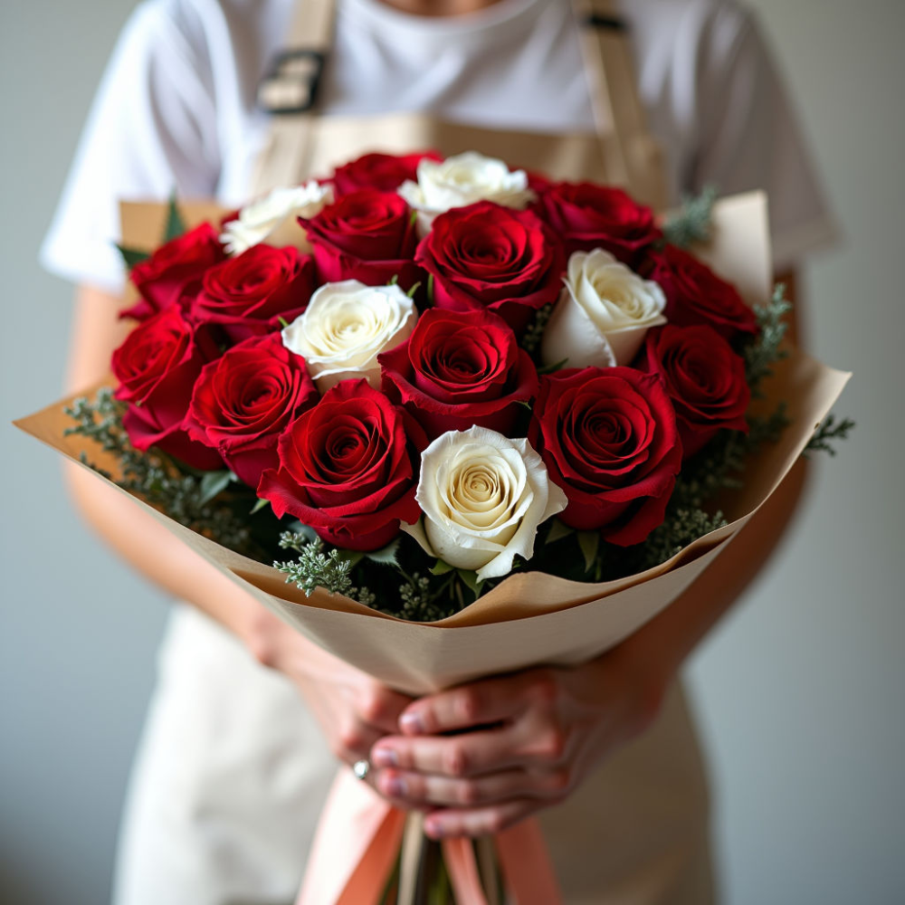 Этот букет поражает своей гармонией цветов, сочетая яркие красные и нежные белые оттенки. Аромат свежих роз наполняет пространство, создавая атмосферу уюта и романтики.