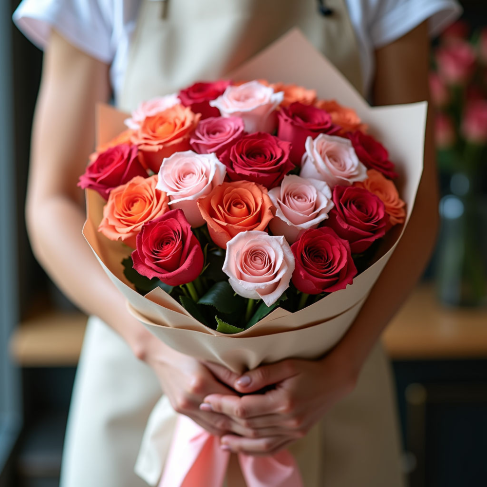 Букет 101 роза микс Кения 40см — это великолепное сочетание 101 розы, привезенных из солнечной Кении. Длина стеблей составляет 40 см, что делает его идеальным подарком для любого торжества или романтического момента.