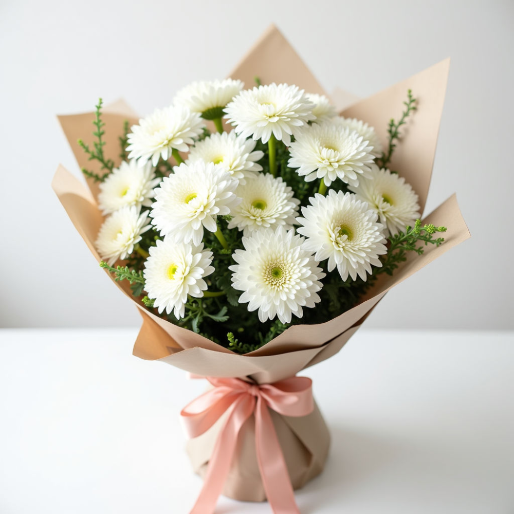 Состав букета: В букет входит от 45 крупных белых хризантем, в зависимости от размера цветков. Для дополнительной декоративности мы используем изящную зеленую флору, которая подчеркивает красоту хризантем и создает гармоничный образ.