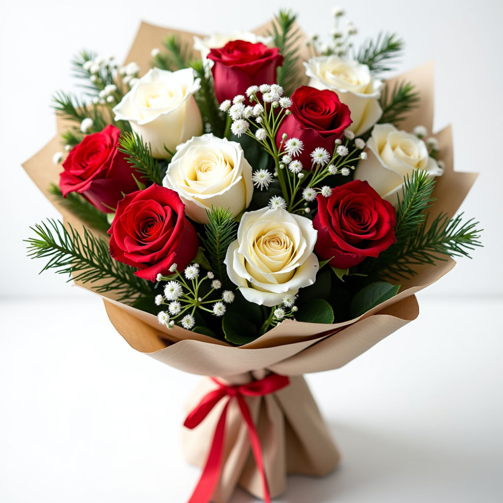 Состав: розы белые и красные, еловые ветки, гипсофила, упаковка — крафт-бумага и атласные ленты. Все цветы отборные, с гарантией свежести.