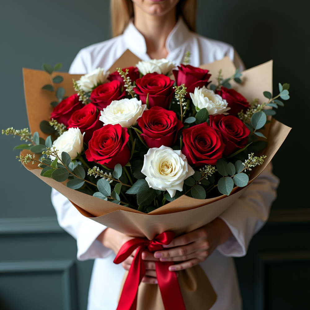 Состав: розы, гвоздики, эвкалипт. Цветы из Нидерландов, упакованы в элегантную крафтовую бумагу с атласной лентой, придающей букету особый шарм.
