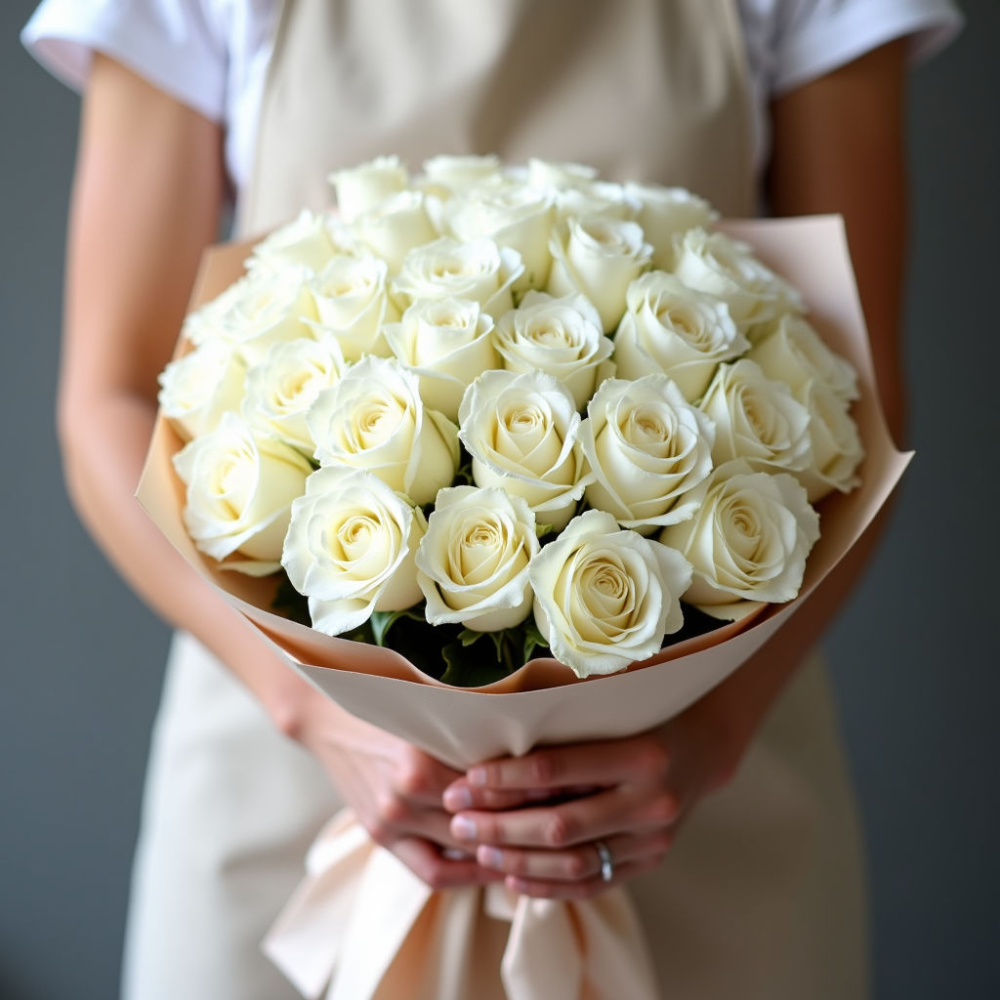 Изысканный букет из 101 кустовой белой розы – символ чистоты, нежности и совершенства. В нем 101 нежная белая роза, собранная опытными флористами.