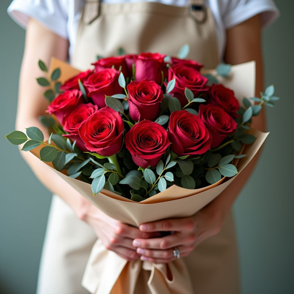 Классический и в то же время современный, этот букет станет прекрасным подарком для любого случая. Нежная зелень эвкалипта подчеркивает красоту роз, создавая неповторимую композицию.