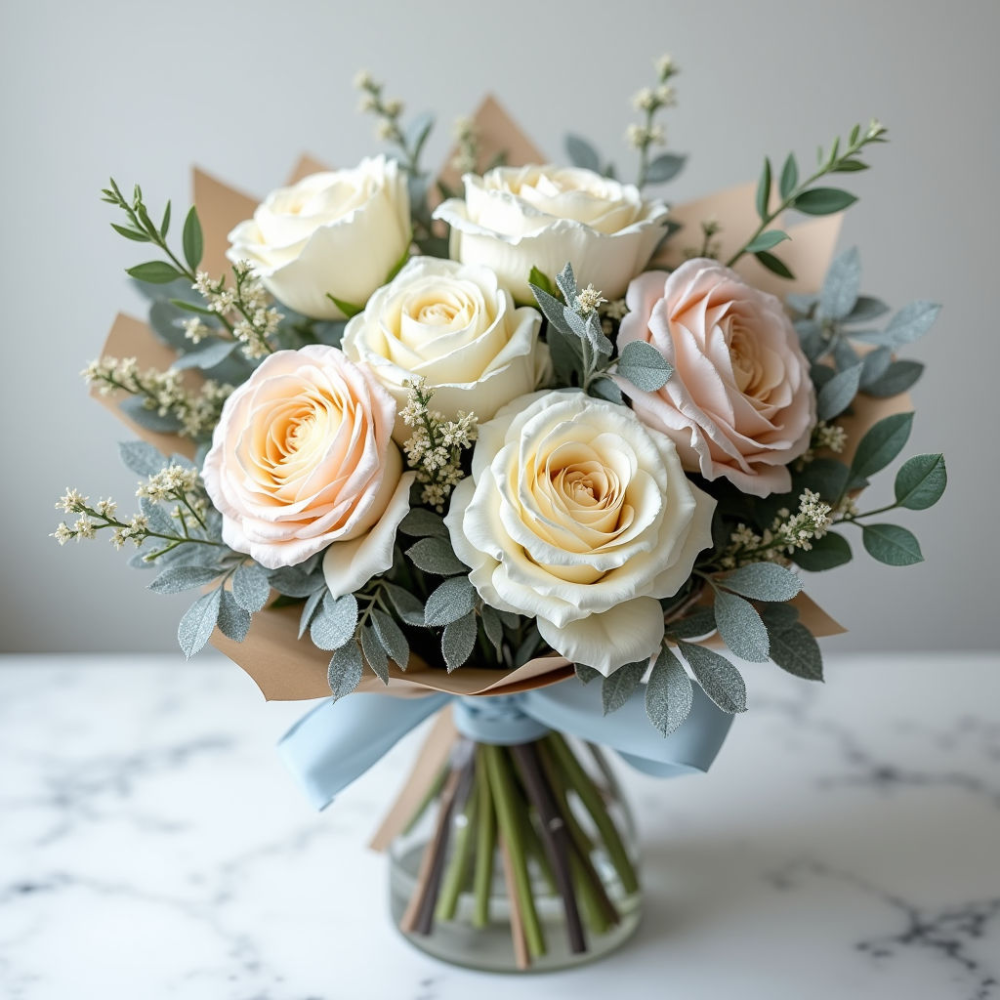 Изысканный букет Морозный день – воплощение зимней свежести и элегантности. Нежные оттенки и изысканное сочетание цветов создадут неповторимую атмосферу.