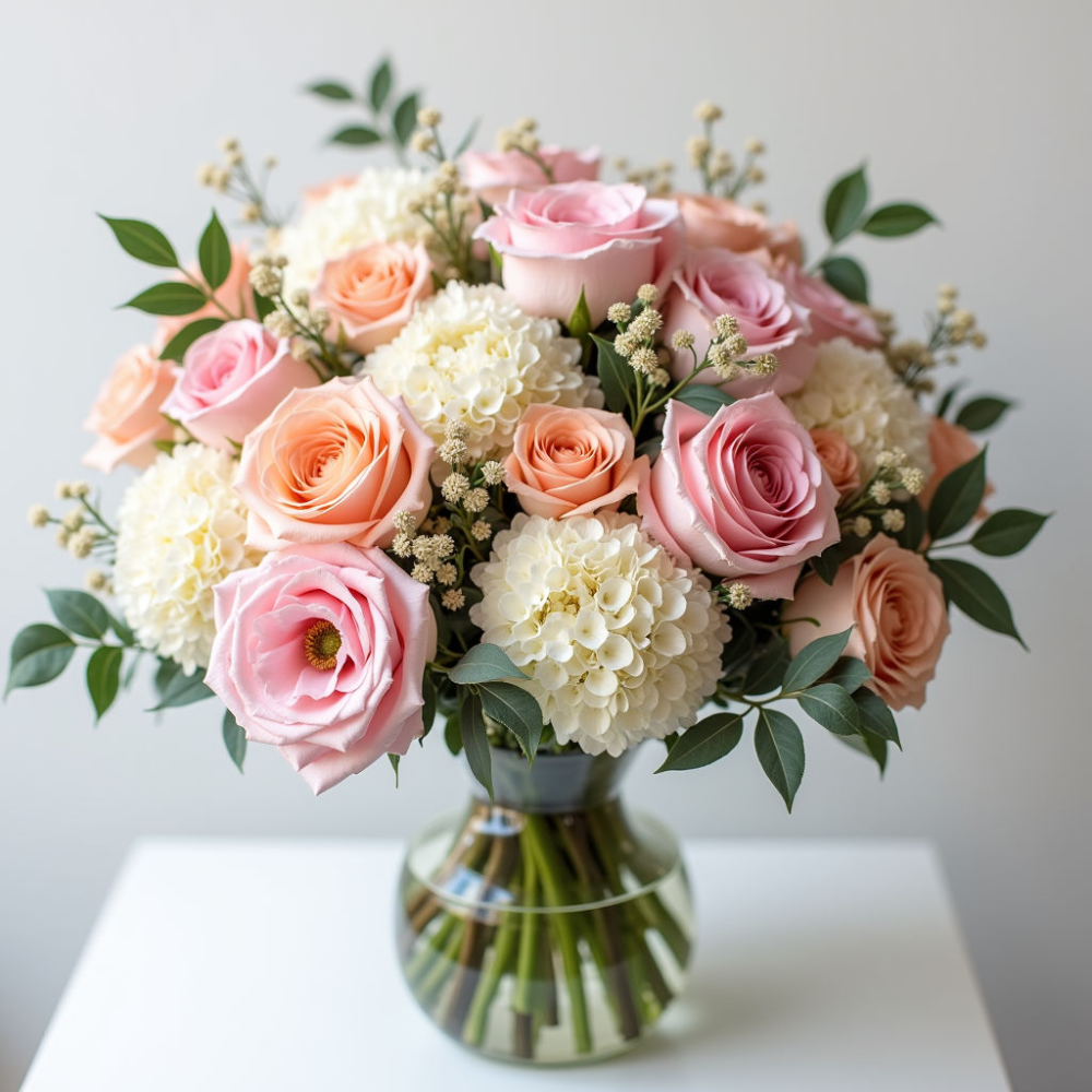 Изысканный букет Октавия – идеальный подарок для особого случая. Сочетание нежных роз, пышных гортензий и благородных гвоздик создает неповторимую композицию.