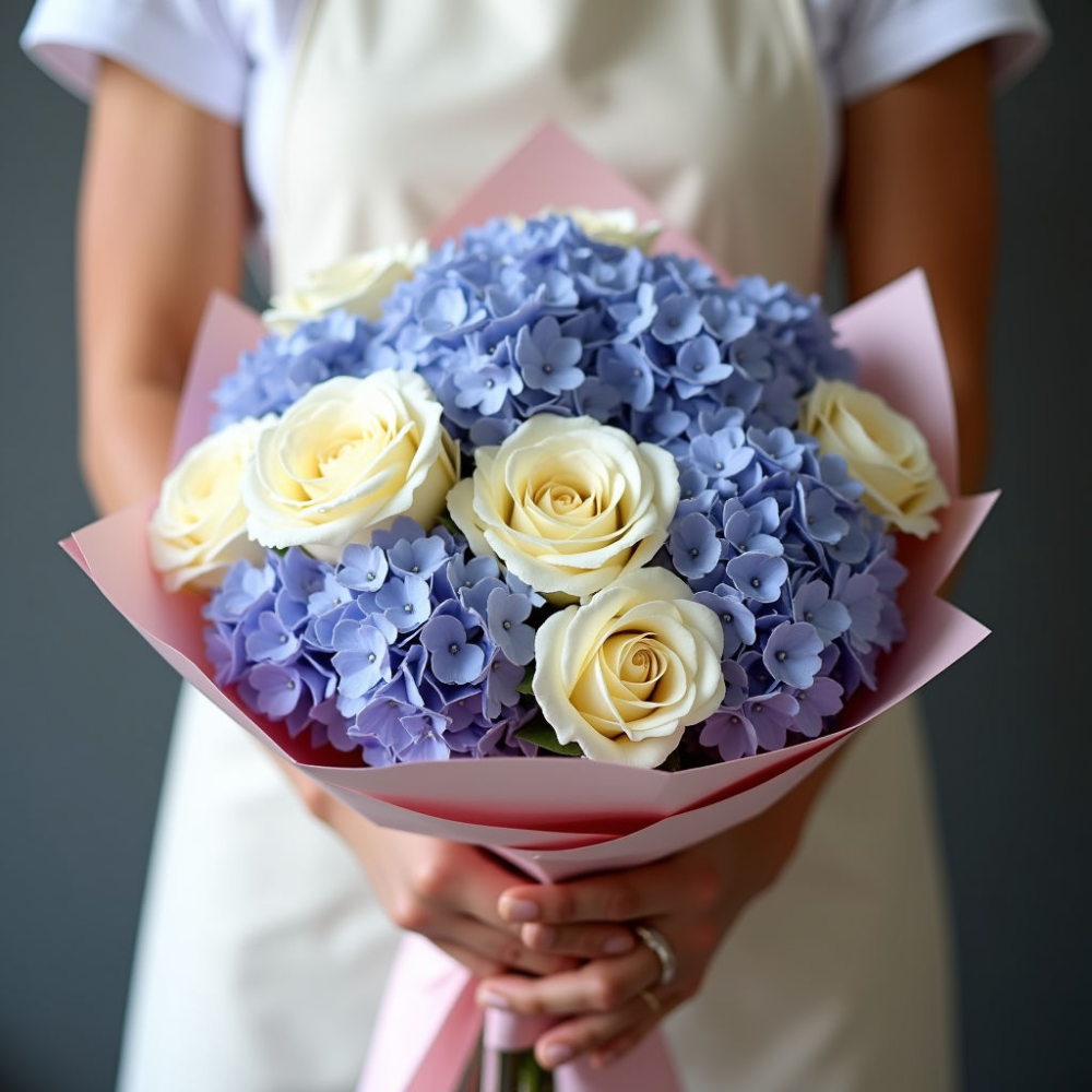 Изысканный букет Симфония – это гармоничное сочетание нежных оттенков и изысканных текстур. В его сердце – роскошные розы Джульетта и Country Blues, дополненные пышными гортензиями.