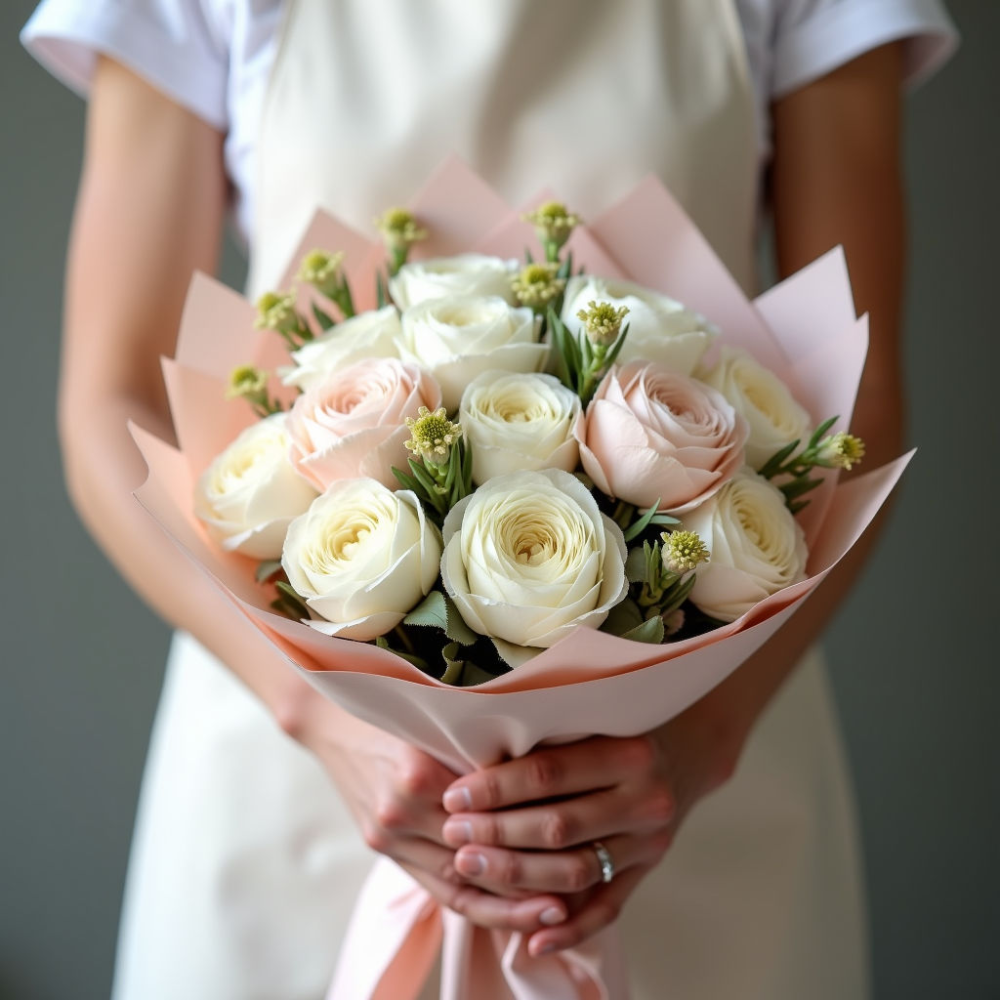 - Пионовидные розы сорта Джульетта — 15 веток. Эти розы известны своими крупными бутонами и нежным кремово-белым цветом. Они символизируют любовь, красоту и совершенство.