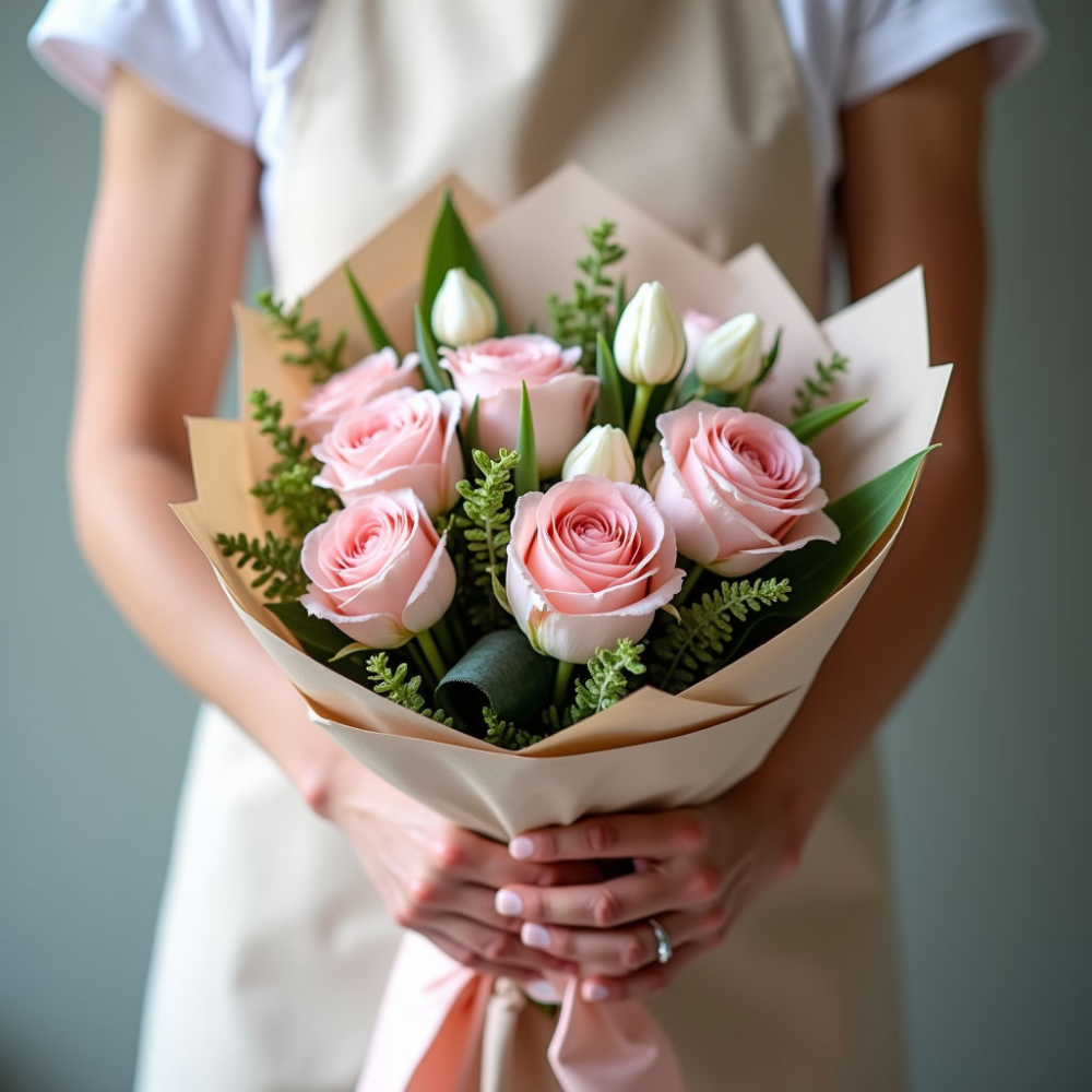 Розы: Мы используем только лучшие сорта роз, отличающиеся нежным розовым оттенком и утонченным ароматом. Они символизируют любовь, нежность и красоту. Каждая роза тщательно отобрана и имеет идеальную форму бутона.