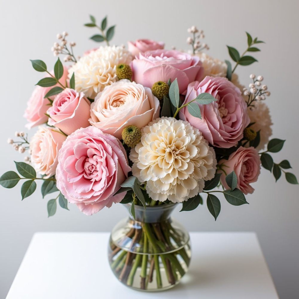 Этот букет – настоящее произведение флористического искусства. Сочетание различных цветов и текстур создает неповторимый визуальный эффект. Нежные оттенки роз Джульетта гармонично дополняют пышные соцветия гортензий, а изящные лизиантусы и матиолы добавляют букету легкости и воздушности. Гвоздики привносят нотку строгости и элегантности, а эвкалипт — свежесть и аромат.
