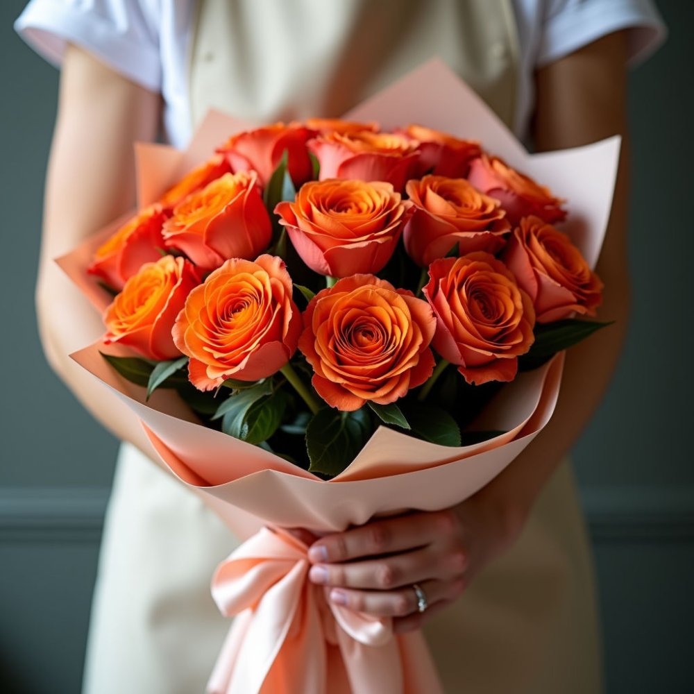 Изысканный букет Зарина – это 25 роскошных оранжевых пионовидных роз, создающих неповторимую атмосферу тепла и радости.